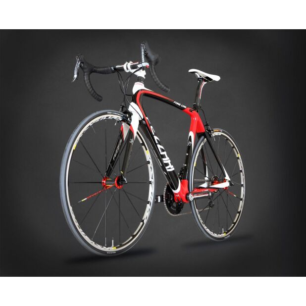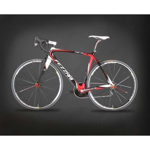 Take, for instance, the state of the art proprietary Fezzari Racing Design Xr7 3K monocoque carbon fiber frame. We used the highest grade of carbon fiber available on the market. We made it even stiffer laterally by enlarging the bottom bracket shell and adding the BB30 bottom bracket/crank design, strengthening the headtube and making it more laterally stiff by enlarging the diameter to a 1.5" tapered design. We've also enlarged the seatstays near the rear axle for more lateral rigidity. We made the Xr7 frame even more vertically compliant for those rides on the cobblestones. We've done this by using an oval design in our top tube and down tube. The new Xr7 frame is even more aerodynamic than before with the new F4 ultralight bladed carbon fork and internal cable routing on the top tube. The Xr7 frame was recently tested to be one of the most durable frames on the market, and it weighs a mere 900 grams. Strength, lightweight, rigidity where you need it most, and flexible enough to take the edge off of rough roads -- it's the perfect frame for anyone who wants to get the most out of their riding experience.